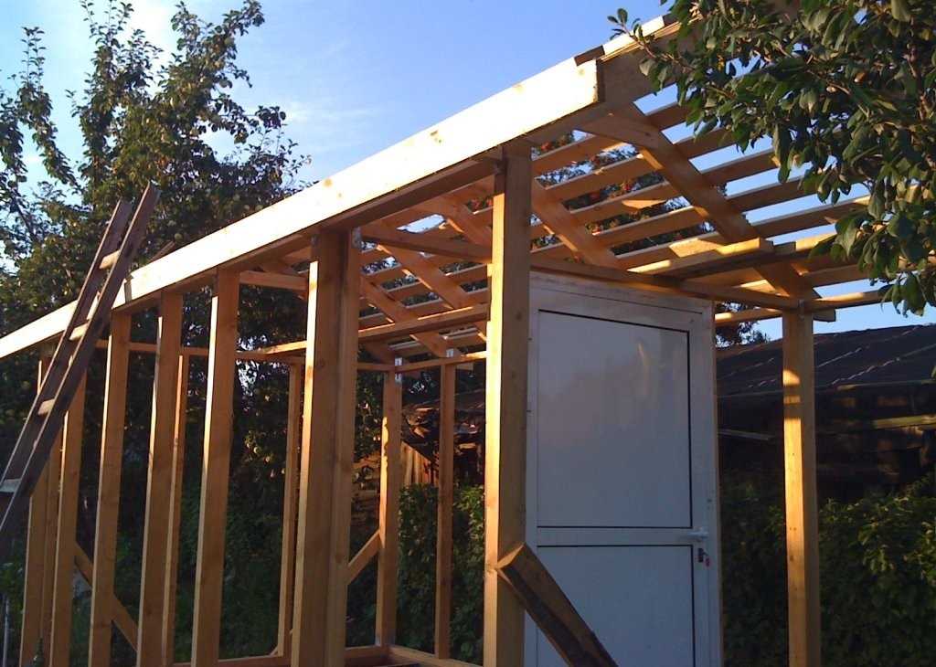При этом нужно обратить внимание на то, чтобы концы обвязки выпускались с задней и передней части сарая на 20-30 см. На верхнюю обвязку устанавливают обрешетку, которую сверху накрывают рубероидом и шифером.