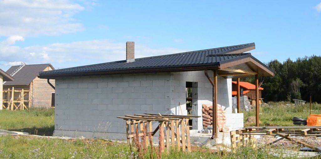 Для правильного распределения нагрузки на стены (пеноблок считается достаточно мягким материалом) на них укладываются деревянные брусья и прибиваются балки перекрытия. После чего наверх ставится стропальная система крыши, которая чаще всего укрывается рубероидом, профнастилом или шифером.