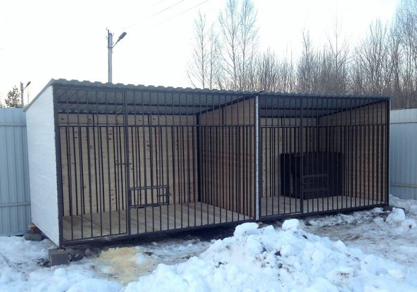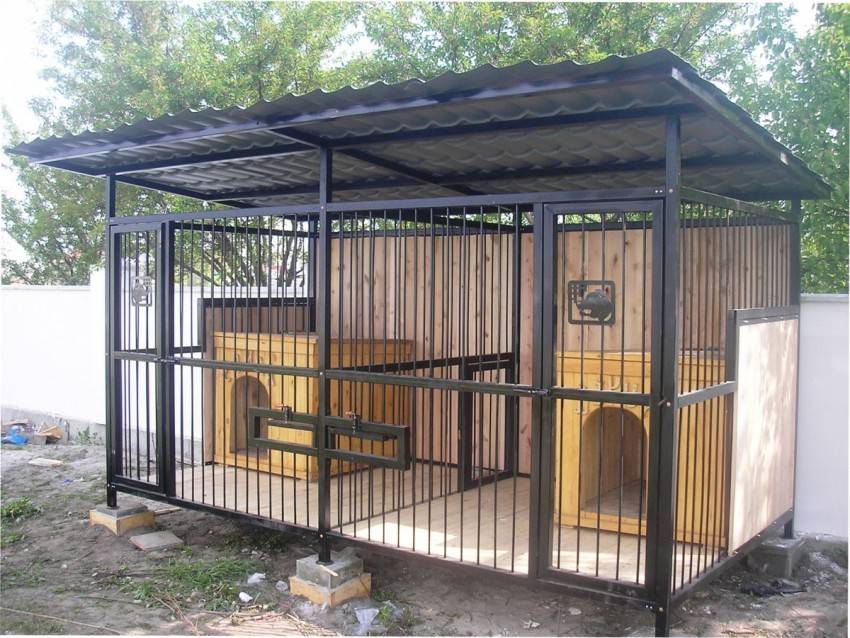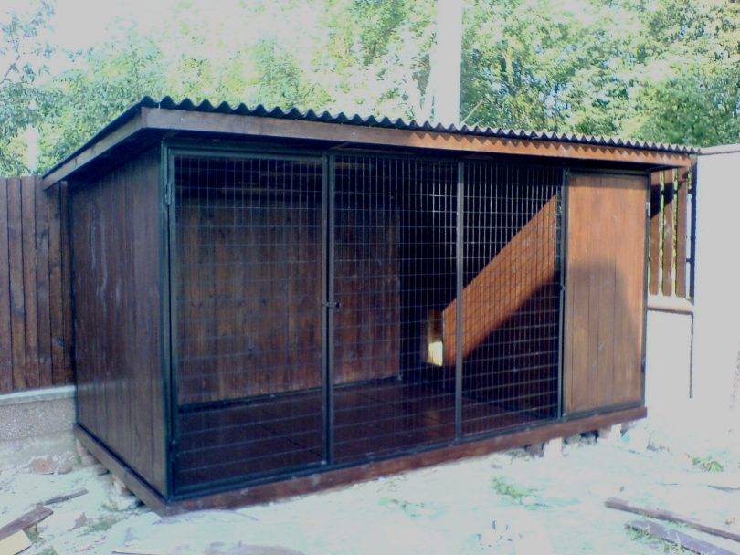 Дверь делается из уголков, которые свариваются в виде четырёхугольника, она обшивается фанерой, жестью, металлическим листом или досками. Каждая порода собак имеет свой темперамент, например, для флегматичных крупных мастиффов достаточно будет пространства 12–14 метров. Для более подвижных и энергичных (хаски или немецкая овчарка) потребуется не менее 17 квадратных метров.