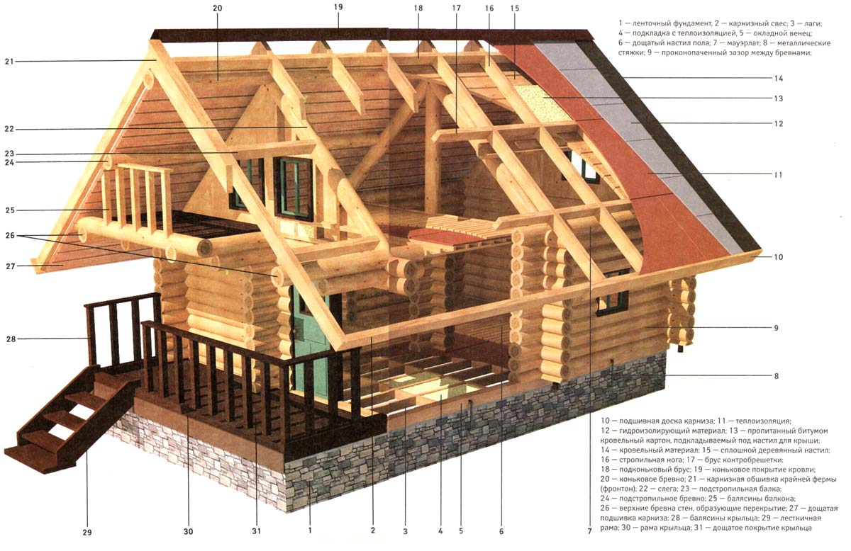 Кровля сооружается из стропильных ферм, которые нагелями крепятся к продольным балкам. Затем делается обрешетка досками, укладывается паро- и гидроизоляция кровли. После чего можно приступать к монтажу кровельного материала.