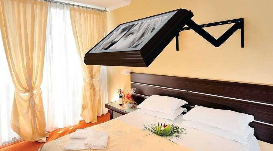 Что интересно, при некоторых разновидностях кронштейна можно повесить телевизор не на противоположной от изголовья постели стене, а непосредственно над спальным местом. Правда, в этом случае нужно серьезно озаботиться прочностью креплений и надежностью системы в целом – и на всякий случай выбирать не очень тяжелые модели.