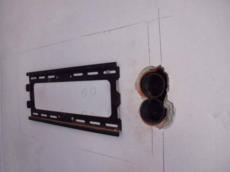 С помощью дрели засверливаем отверстия в указанных местах. Чтобы не попасть на проходящую под отделкой электропроводку используйте самодельный металлоискатель. Данное устройство также поможет найти профиль под листом гипсокартона (в него нужно засверливаться при установке телевизора на стену).