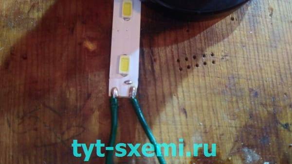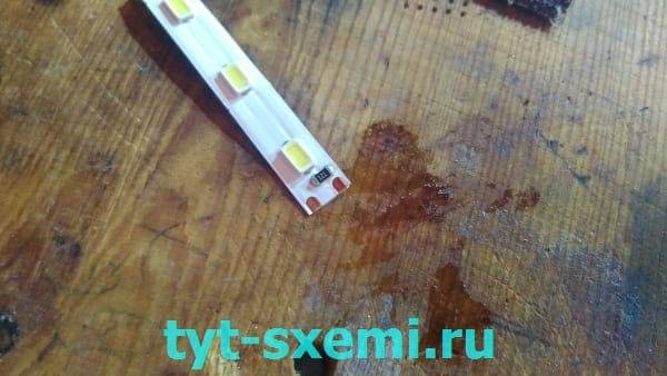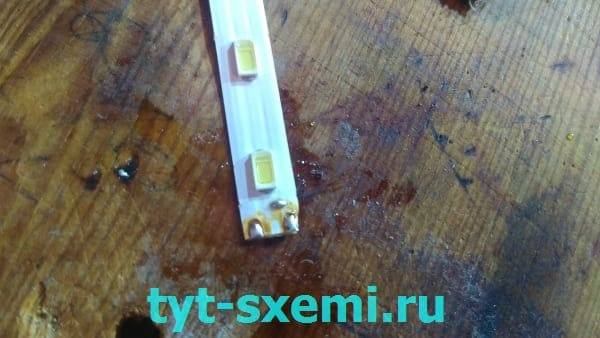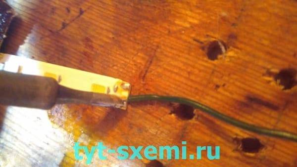 Далее, берем паяльник от себя ручкой, прислоняем провод к контакту и сверху жалом паяльника. Пайка должна длиться не дольше секунды, пока есть флюс. Это связано с тем, что медная подложка быстро забирает тепло, а сгорающий флюс уже не в состоянии собрать припой в единое целое. Поэтому, если паяльные работы будут длиться больше секунды, то на ленте будут комочки припоя с признаками холодного контакта. Если такое произошло, снова наносим флюс и одним касанием исправляем плохую пайку.