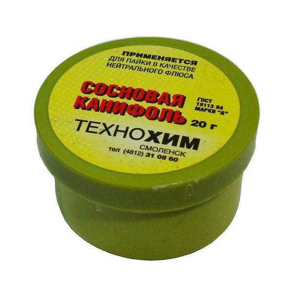 Канифоль – это похожий на стекло материал с температурой размягчения в пределах 55–70℃. Для его производства используют смолу хвойных пород дерева. Регламент прописан в ГОСТах 19113-84 и 14201-83, где сказано, что продукт растворяет патину. Рабочий диапазон температур при пайке бытовых приборов составляет 100–130℃.