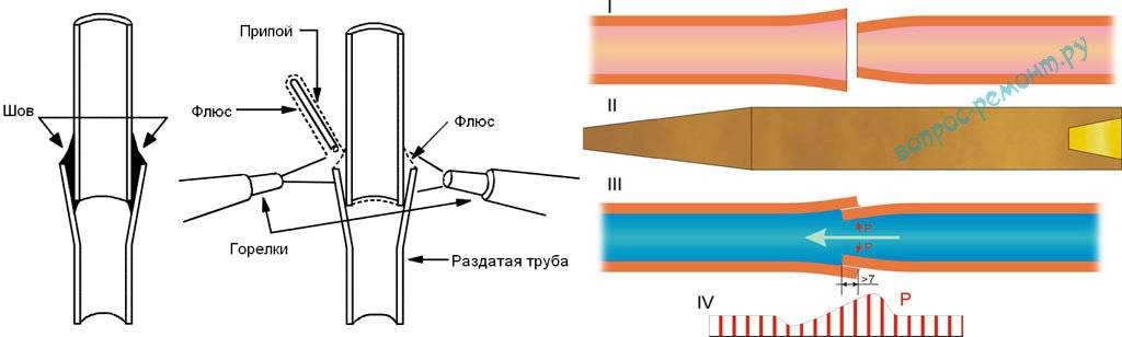 Важнейшее условие надежности такого стыка – сужение должно быть ориентировано по току воды, поз. III. Школьный закон Бернулли – обобщение для идеальной жидкости в широкой трубе, а у реальной жидкости в узкой трубе за счет ее (жидкости) вязкости максимум скачка давления смещается противоположно току, поз. IV. Возникает составляющая силы давления, прижимающая зауженную трубу к раздатой, и пайка получается очень надежной.
