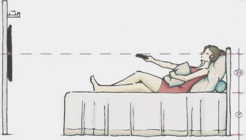 - Несмотря на то, что спальня чаще ассоциируется только с местом для отдыха, все же многие предпочитают иметь здесь телевизор или монитор. При фиксации телевизора на стене следует придерживаться правила определения центра экрана. Он определяется путем добавления к высоте кровати 30 — 35 см.