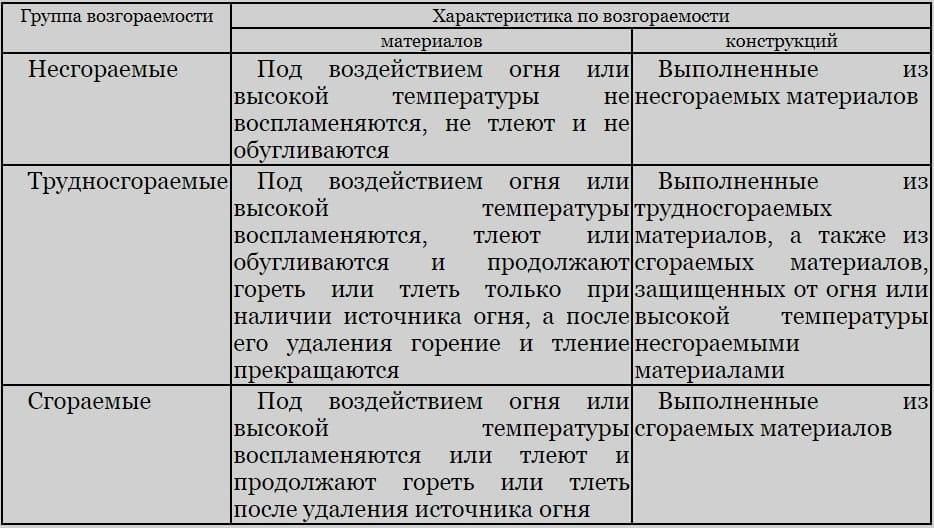 Все перечисленные характеристики материалов и конструкций из них сделанных, относятся к характеристикам возгораемости и являются нормативными группами возгораемости.