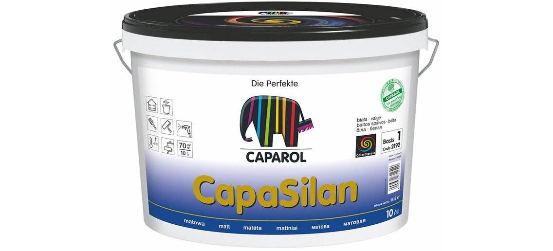 В состав этой износостойкой матовой краски не входят растворители. Главное преимущество этой краски заключается в том, что при нанесении даже в плохо освещенном помещении, на стене получается равномерное монолитное покрытие без заметных мест перекрытия смежных участков. Состав краски отвечает действующим санитарным нормам. Покрытие подходит для пористых оснований, имеет высокую укрывистость. Краска «Caparol» «CapaSilan» может применяться в помещениях с высокими требованиями к экологичности и гигиеничности отделочных материалов.