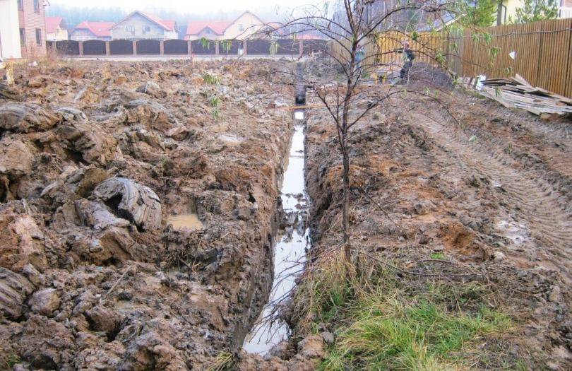 Бывает, что вода стоит только потому, что у вас глинистый тяжелый грунт. В таком случае, если не возможности сделать подсыпку, нужно устраивать дренаж. С его помощью вы сможете осушить болото на участке. Чтобы выполнить работу по прокладке дренажной системы, вам понадобятся некоторые знания, грамотный расчет, точное планирование.