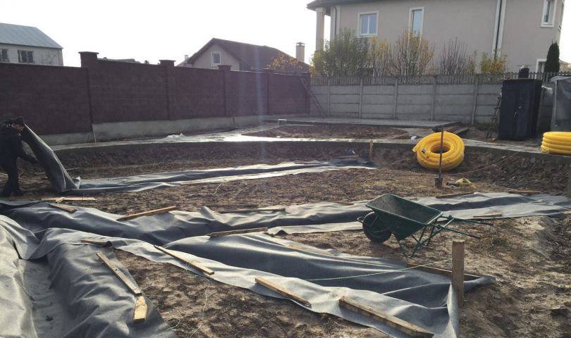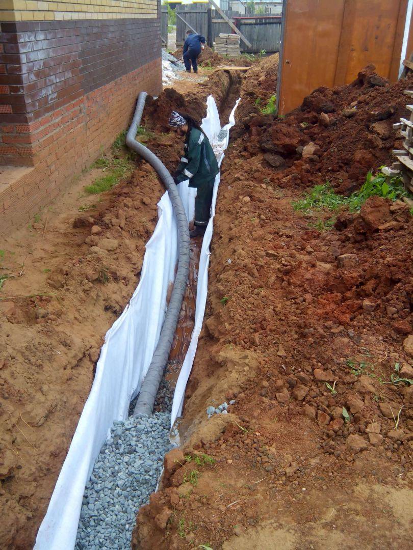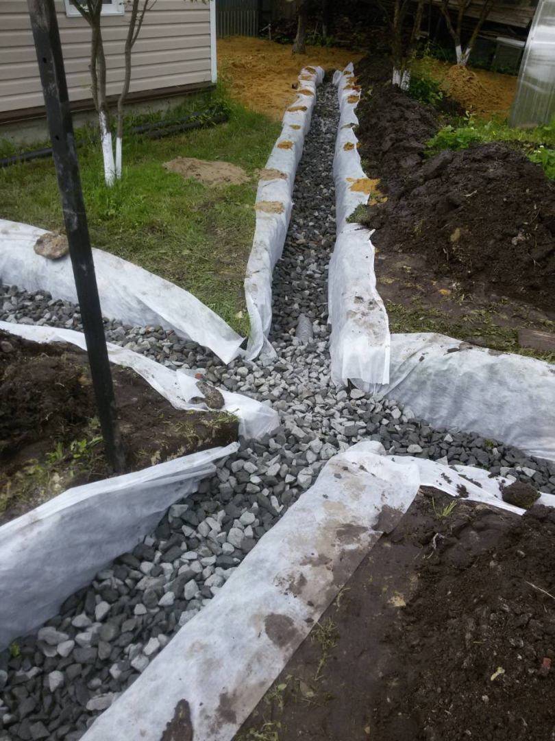 Такого плана дренажная система обычно очень быстро заиливается. Оградиться от данной неприятности можно просто постелив перед самой засыпкой небольшой слой из специального материала, например, геотекстиля, который будет выполнять важную функцию фильтра. Материал идеально будет впитывать воду и одновременно с этим не пропустит мелкие частицы.