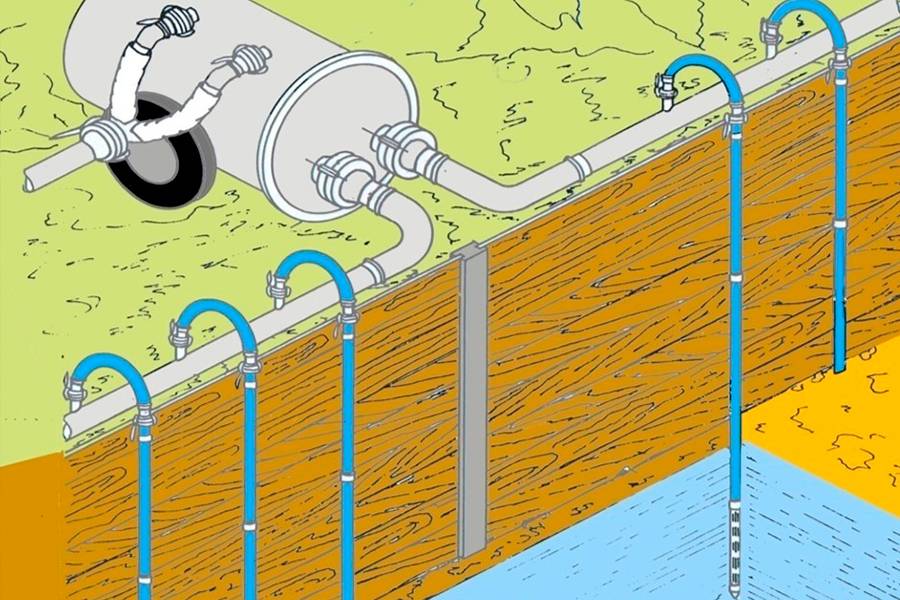 Такой способ осушения грунта способен обеспечить удаление влаги с глубины до 20 м. Система состоит из стальных труб, которые вертикально вкапываются в землю. На их нижних концах установлены сетчатые фильтры с латунными или полимерными сетками, защищающие трубы от попадания в них грунта.
