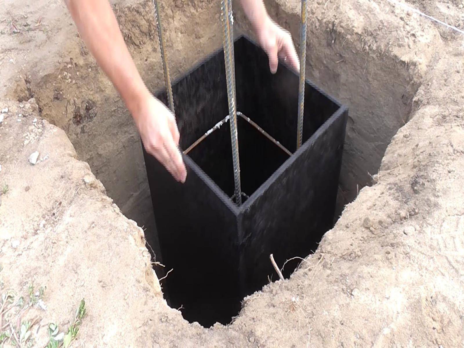 ШАГ 5: опалубка. Чтобы не делать внутри ямки опалубку из деревянных досок, можно использовать рубероид, как форму для будущего столбчатого фундамента. Этот рубероид будет отличной гидроизоляцией для основания фундамента.