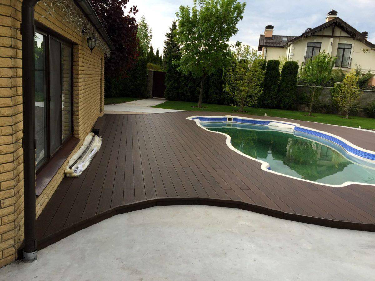 - для настила используют специальный материал – так называемую палубную доску (декинг). Это может быть натуральное дерево с особой обработкой (обычно лиственница), композитный материал или чистый полимер. Особенностью доски является повышенная стойкость к влаге, рельефная поверхность;