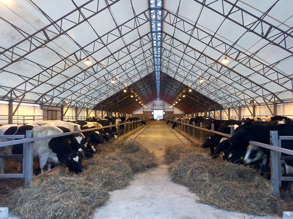 - Тентовые коровники. Тент крепится на металлический каркас с помощью ремней и тросов. Легкость в возведении, светопроницаемость мембраны, огнестойкость ─ далеко не все преимущества данного варианта.
