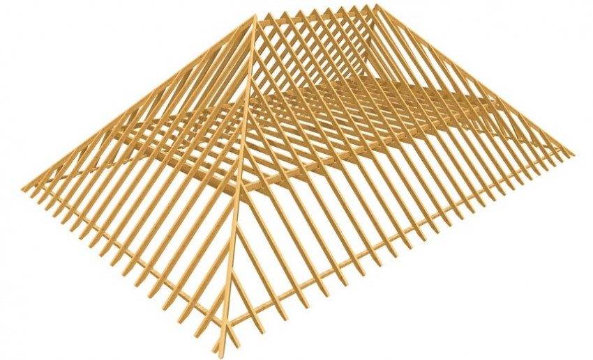 Четырехскатная крыша за счет угловых ребер, сходящихся к опорной балке конька, имеет жесткую конструкцию и не подвержена сколько-нибудь серьезным деформациям.