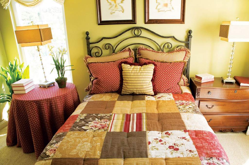 В общей гамме расцветок покрывал, штор, ковриков должно соблюдаться естественное сочетание оттенков. Универсальные цвета – охра и коричневый, зеленоватый и кремовый. Изюминкой дизайна деревенской спальни может стать лоскутное покрывало, сделанное своими руками в технике пэчворк.