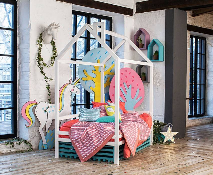 Прекрасный вариант, когда кровать сама станет декором. В магазине вы найдете большое разнообразие моделей детских кроватей: в виде ракеты, самолета, замка и др. Дети обязательно оценят такую задумку, а комната станет настоящим произведением искусства с такой кроватью.