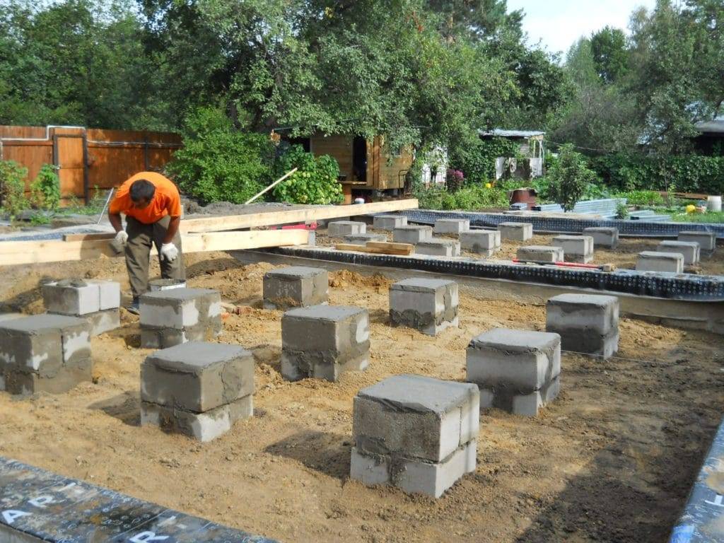 При закладке столбчатого или ленточного варианта подошвы основания также задействуют фундаментные блоки или керамический кирпич.