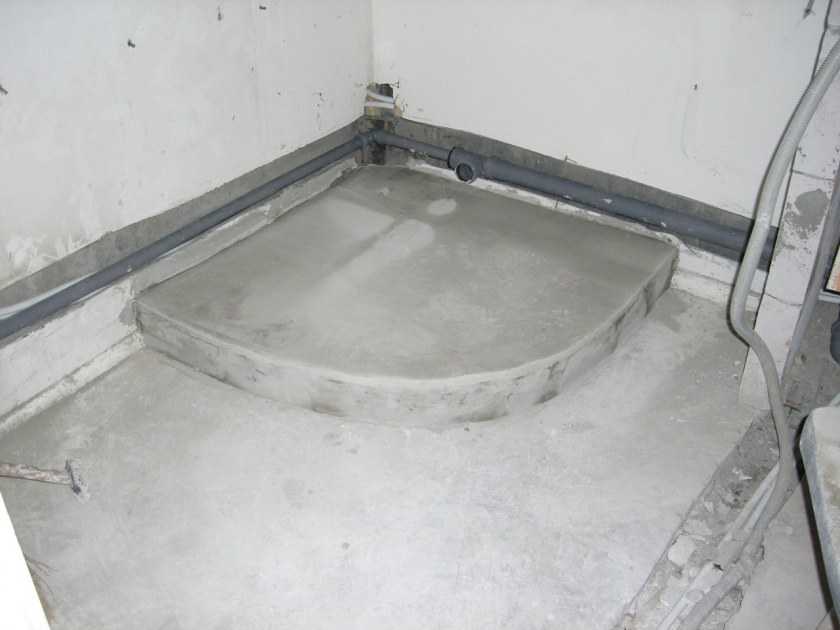 Основание бывает с поддоном разной высоты, поднятым на подиум, на уровне пола помещения. Слив воды происходит через установленный душевой трап и канализационные трубы.