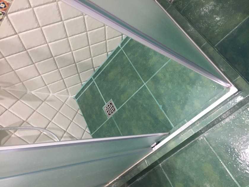 Недостатком конструкции является необходимость установки водонепроницаемой шторки, которая должна лежать на полу кабинки с нахлестом 4-5 см. Такое решение позволяет стекать воде по шторе и не попадать в помещение санузла.