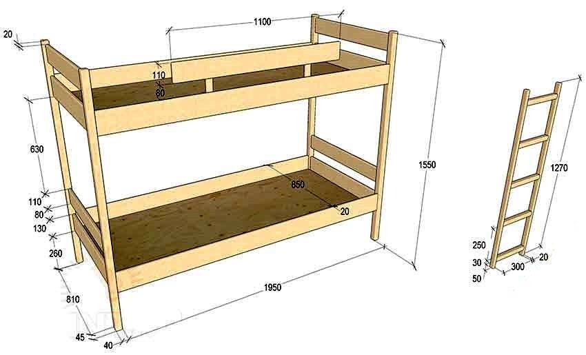 Прежде чем начать изготовление двухуровневой кровати, нужно составить подробный чертёж мебели с указанием точных размеров. Все детали объединяют в единую спецификацию, чтобы понимать, чего и сколько покупать.