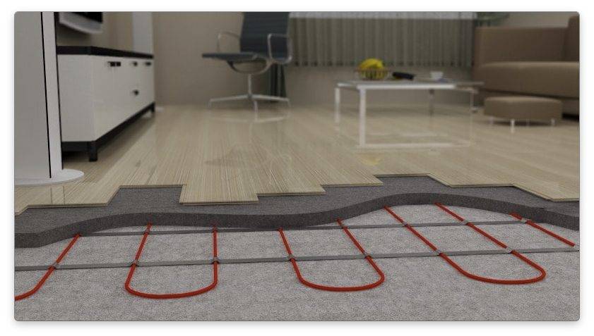 - Уложенный кабель под ламинат или плитку (речь идет о напольной), но выше уровня стяжки.
