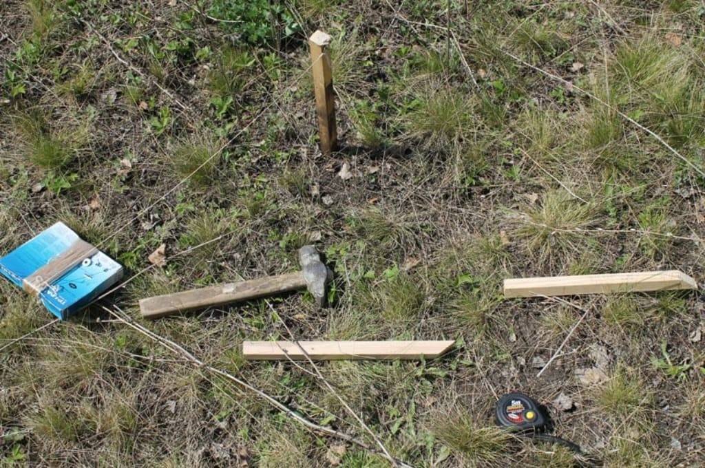 Второй шаг. Вбиваем колышки с двухметровым шагом по периметру участка, в месте установки забора.