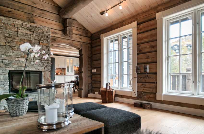 В домах из бруса или бревна популярный вариант дизайна интерьера с минимальной отделкой.