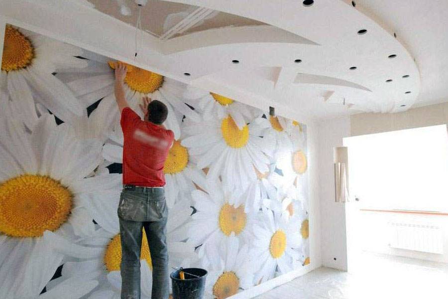- Оклейка фотообоями потолка.