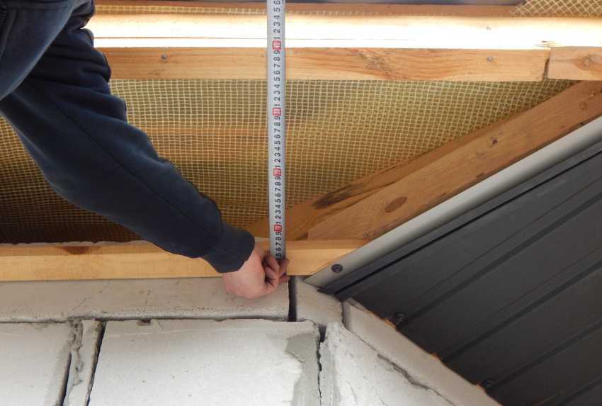 - Замеряют расстояние между стеной дома и внешним краем лобовой планки, отнимают от него 15 мм. Полученное значение — это необходимая длина профилированного листа.