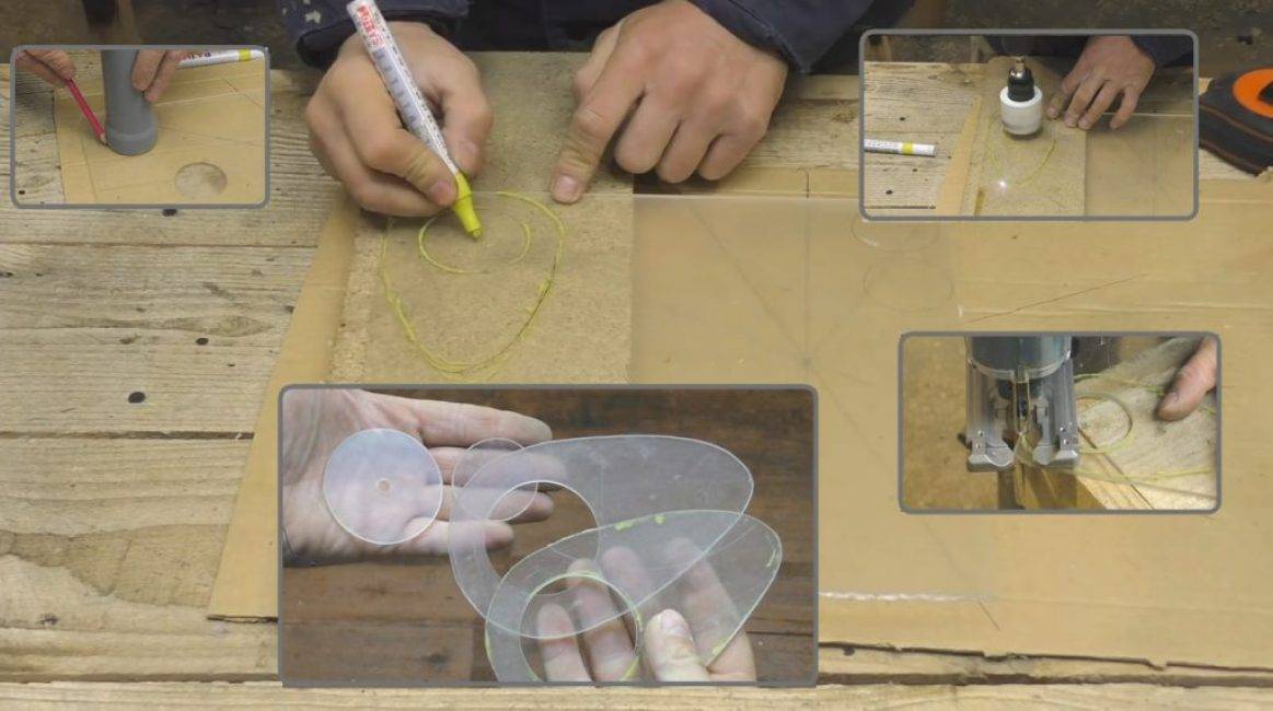 Для этого на листе диэлектрика, подготовленной ранее трубой (шпулей), размечаем место крепления рукоятки. Также рисуем форму будущей ручки в произвольной форме. Таких заготовок нужно 2 шт.