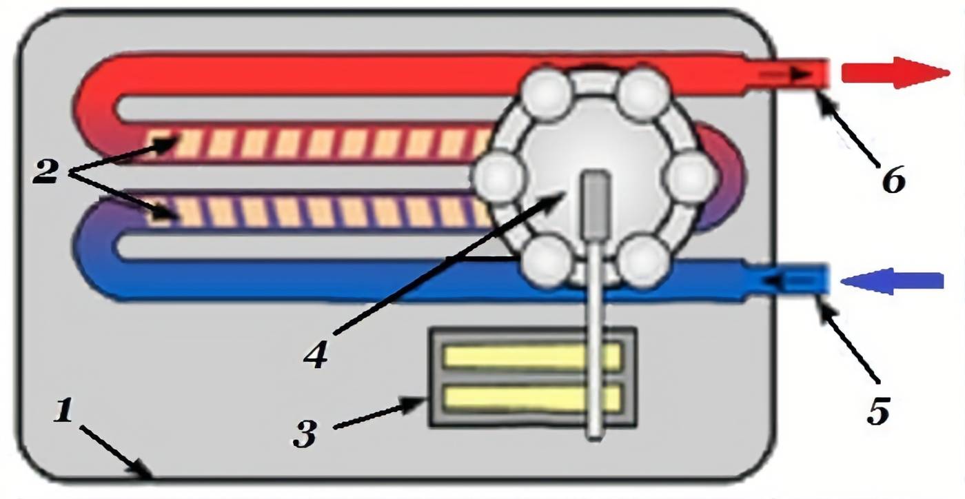В корпус устройства поступает входная труба холодного водопровода. Жидкость проходит через нагревательный элемент (представлен ТЭНом или спиралью). Труба с повышенной температурой содержимого выводится из водонагревателя.