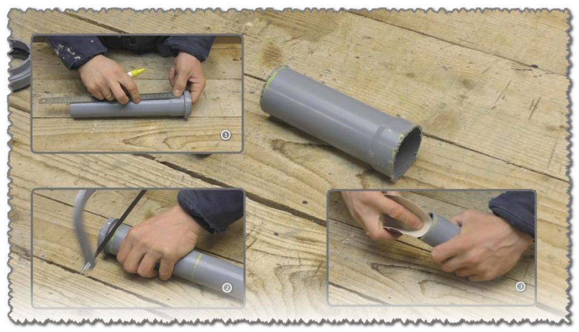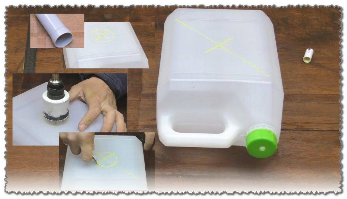 Замеряем ширину канистры и отмечаем этот размер на трубе, отступя от внешнего канта.
