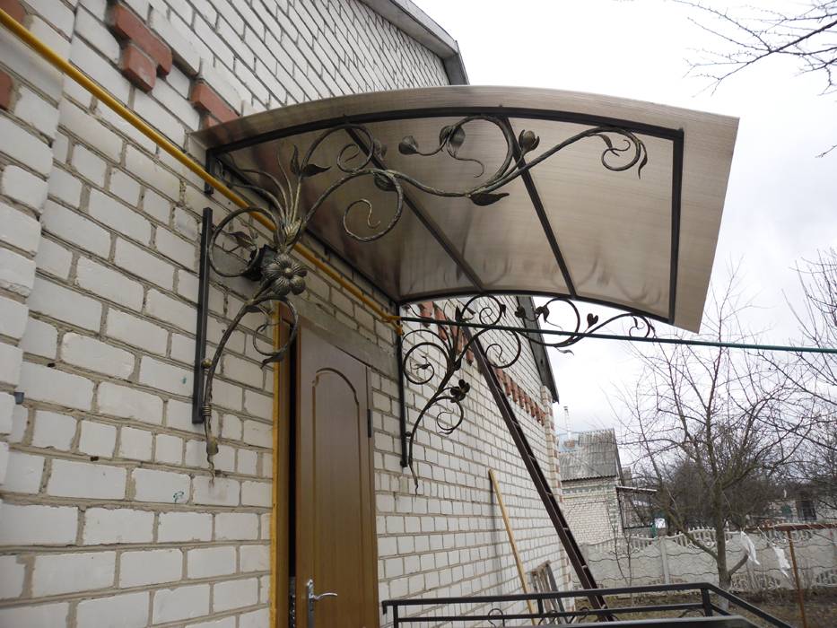 Навес из поликарбоната над крыльцом: на фото кованая конструкция