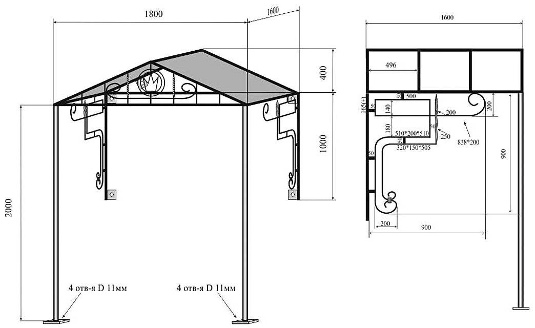 Перед монтажом навеса следует правильно подобрать материал. Кроме того, следует заранее подготовить эскиз конструкции. Чертеж должен учитывать погодные условия в регионе. Чаще всего для средней полосы России выбирают дерево. При выборе такого материала фронтоны можно украсить резьбой. При этом древесину довольно просто обрабатывать.
