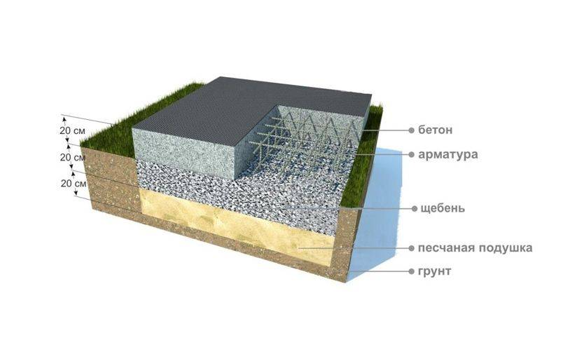 Можно сделать столбчатый фундамент – в принципе, возводимая конструкция не отличается огромным весом. Но для этого понадобится возводить столбы (заливать из бетона с помощью опалубки и арматуры), затем ждать их полного высыхания… В общем, лишняя трата времени, и финансов, кстати, тоже. Мы же предлагаем сделать фундамент непосредственно на подложке, которая уже обустроена из песка и щебня. Тут все просто – сверху укладывается сетка из металлических прутьев, и утрамбованные слои подложки просто проливаются цементным раствором и разравниваются.
