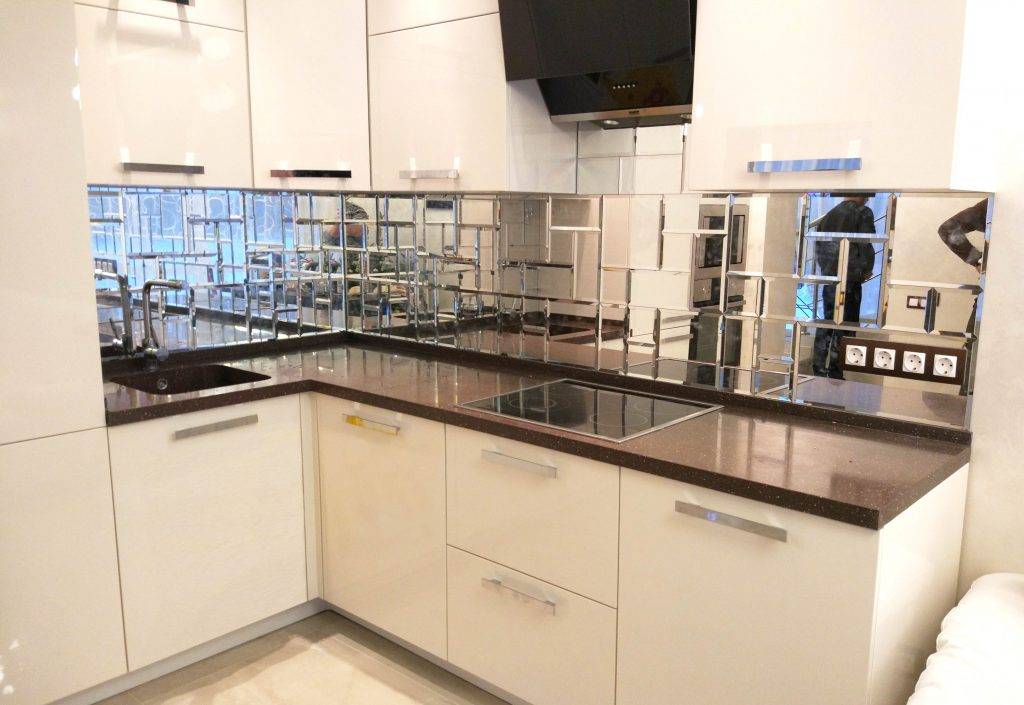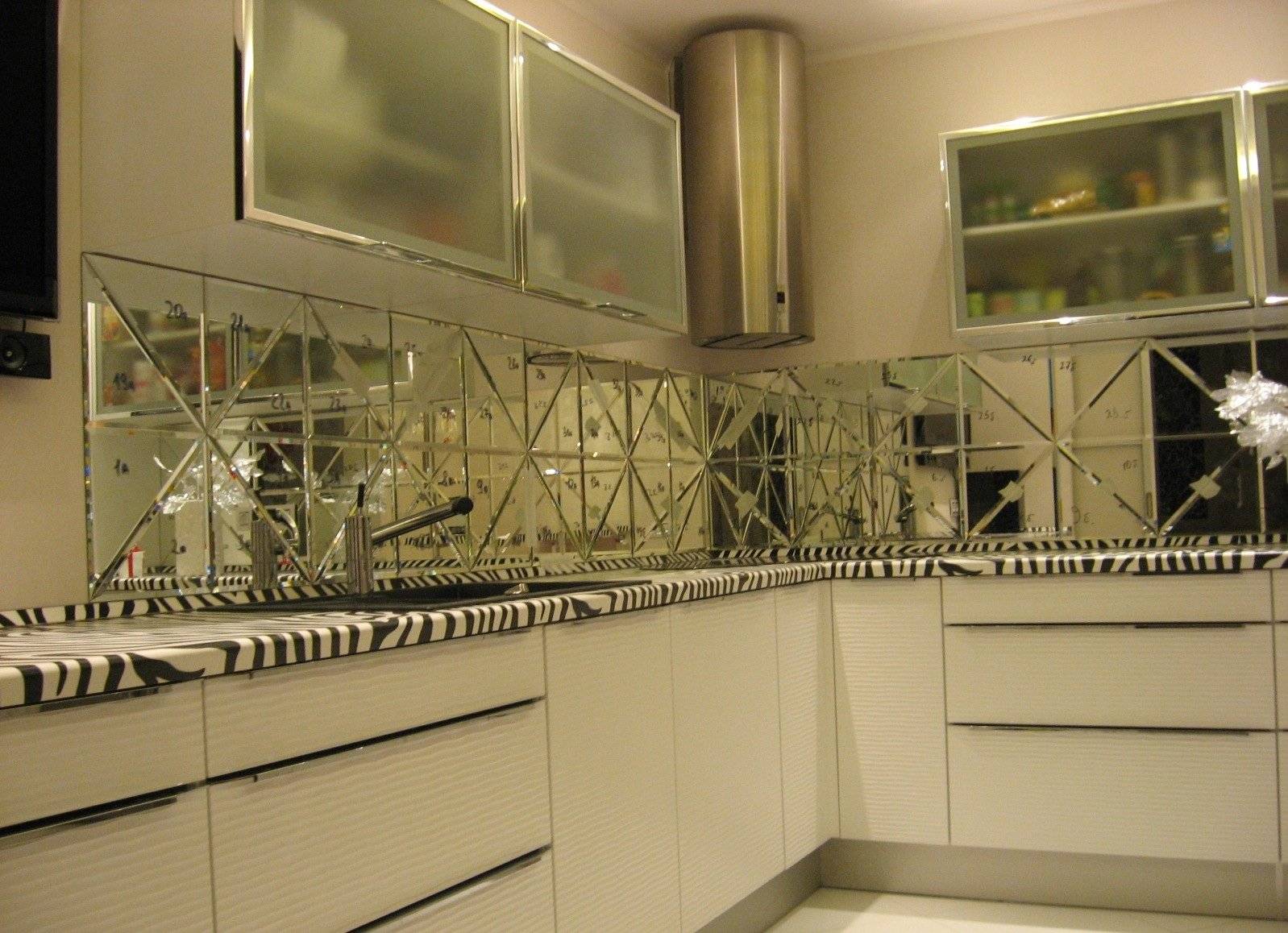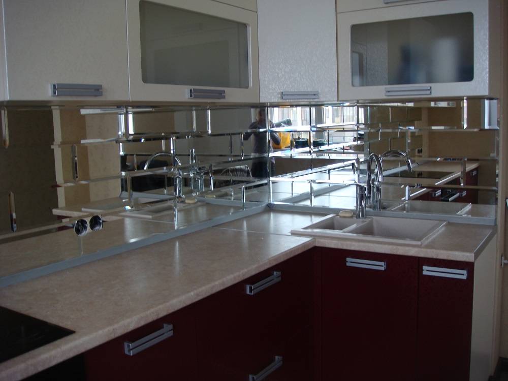 Главное, не использовать для фартука обычное зеркало, которое под воздействием высокой температуры может лопнуть. Для этой цели подойдут специальные термостойкие и ударопрочные стекла.