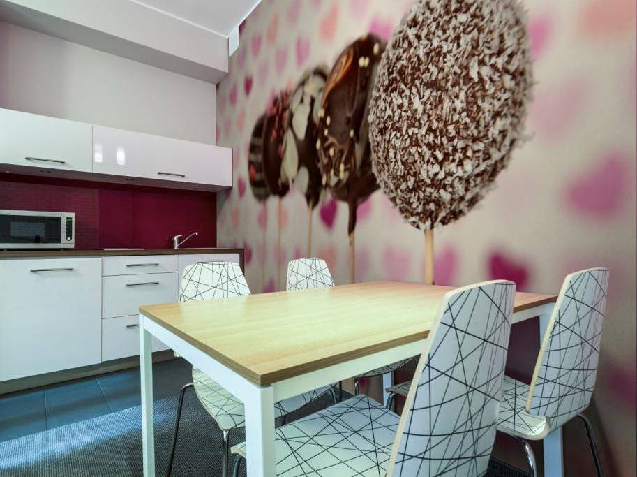 Непродолжительный срок службы заставит через пару лет вновь задуматься над переделкой кухни. Такие обои гораздо выгоднее размещать в обеденной зоне, где на них будет попадать намного меньше грязи.