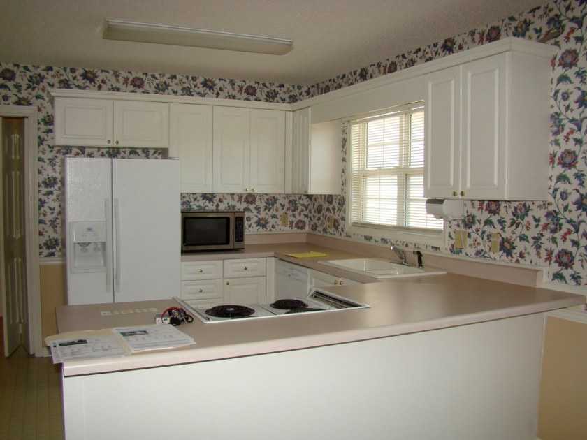 Все стены крашены, и, хотя под ними, скорее всего, гипсокартон, сама отделка стоила недорого и могла быть выполнена самостоятельно. Кухонный гарнитур выглядит несовременным, но при этом хорошо сохранившимся, что наводит на мысль, что его просто весьма аккуратно подкрасили.