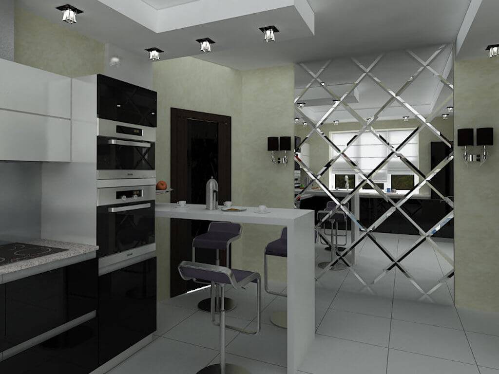 Классическим вариантом является размещение зеркала на стене, где оно будет отражать пространство кухни, добавляя ему объема.