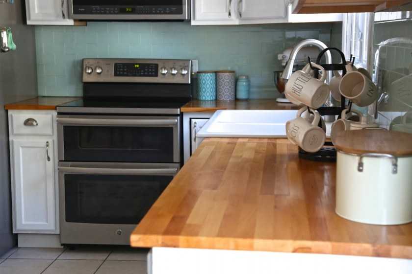 Первое фото – яркий и всесторонний пример того, что выполнение ремонта кухни за весьма скромные деньги вполне возможно. Здесь наглядно показано воплощение в жизнь сразу нескольких советов из числа тех, что были приведены выше. Так, для отделки фартука выбрана однотонная плитка (возможно, ее даже не меняли), которая не требует подстраивания узора и не предполагает большого количества отходов.