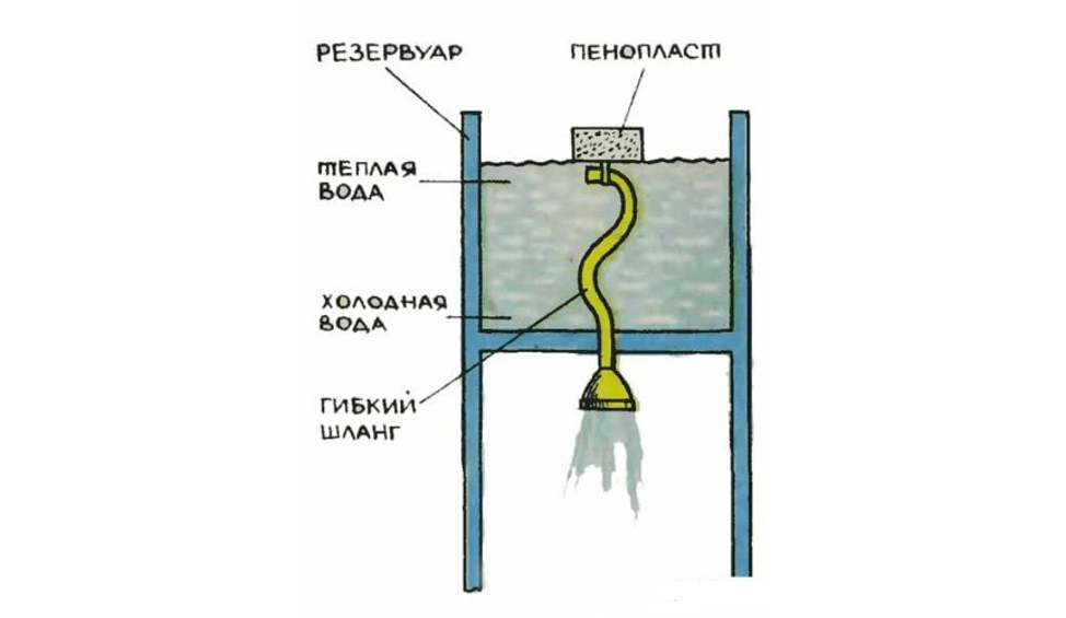 Важный нюанс: шланг для выдачи воды крепят к поплавку в верхней части бака, как показано на схеме выше. Это сделано для того, чтобы осуществлялся забор теплой, нагретой солнцем воды.