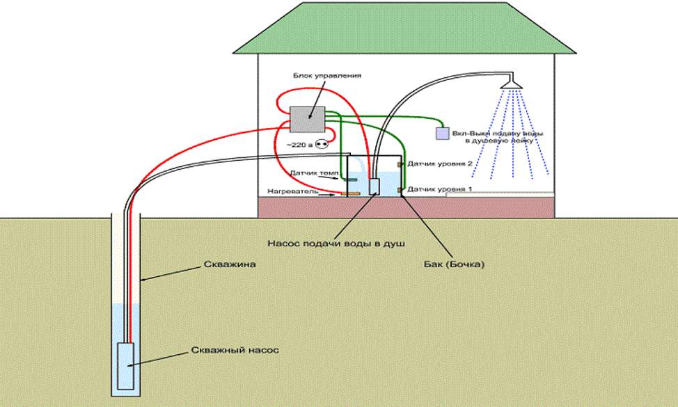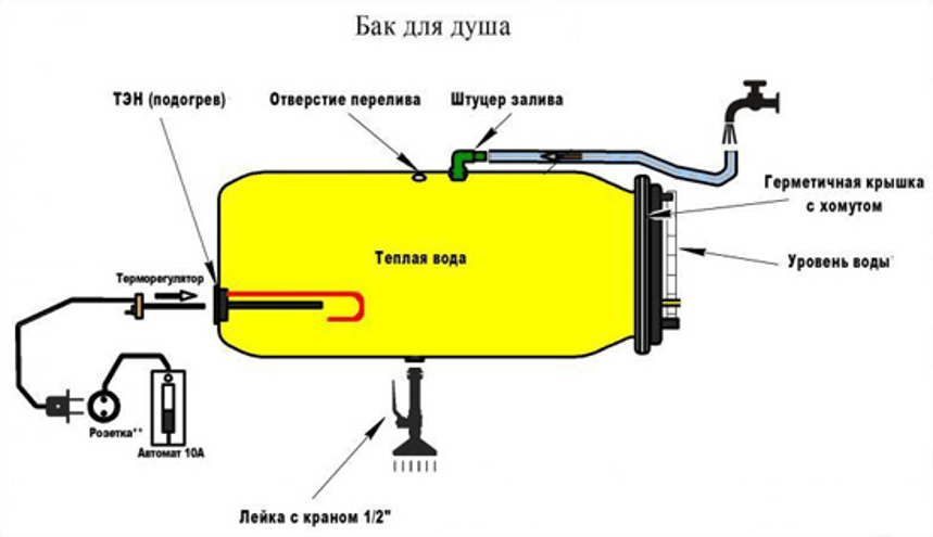 Полностью схема летнего душа с подогревом может выглядеть так.