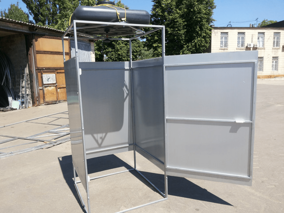 - Бак из оцинкованной стали, который предназначен для низких душевых. Он имеет плоскую форму и короткую встроенную душевую лейку. Объем его составляет 100 и 200 литров. Работает такой бак по типу бойлера и нуждается в постоянном водоснабжении.