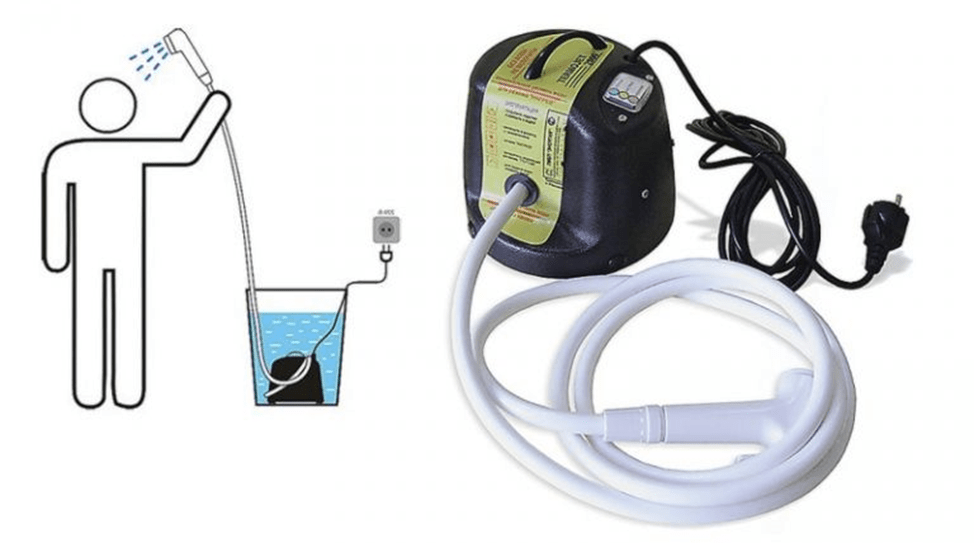 Сюда же можно отнести мобильные «походные» варианты. Фактически это емкость – бутыль, ведро, бак – в которую погружен небольшой насос с шлангом.
