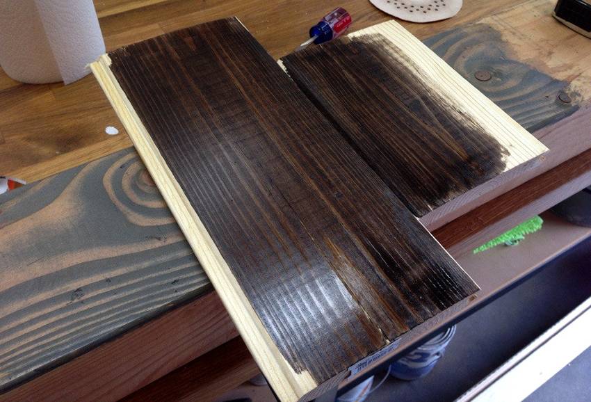 После выбора подходящего оттенка и инструмента необходимо произвести пробный выкрас. Это делается для того, чтобы узнать необходимое количество слоев морилки для получения конкретного оттенка. Для этого необходимо: