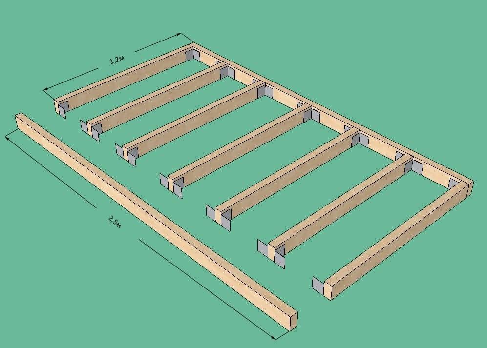 Перпендикулярно двум балкам обвязки укладываются перемычки, которые нужны для создания пола. Они фиксируются с шагом в 0,5–08 м. После чего устанавливаются вертикальные каркасные элементы с использованием уголков. При этом первым делом нужно установить задние стойки, потом средние и в конце передние. Чтобы обеспечить жесткость конструкции, используются временные раскосы.