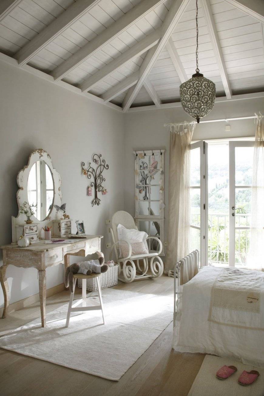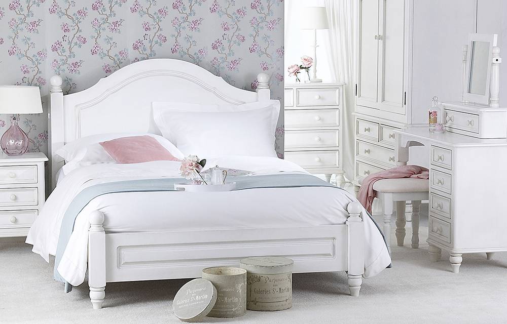 Белая спальня в стиле кантри с использованием ярких цветочных мотивов