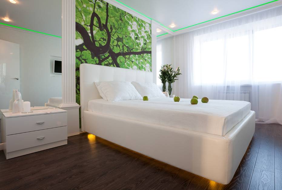 Зонирование. Оно предназначено для выделения и визуального разделения в комнате рабочей зоны и отдельной зоны для сна. Такой дизайн подходит для однокомнатных квартир или квартир-студий.
