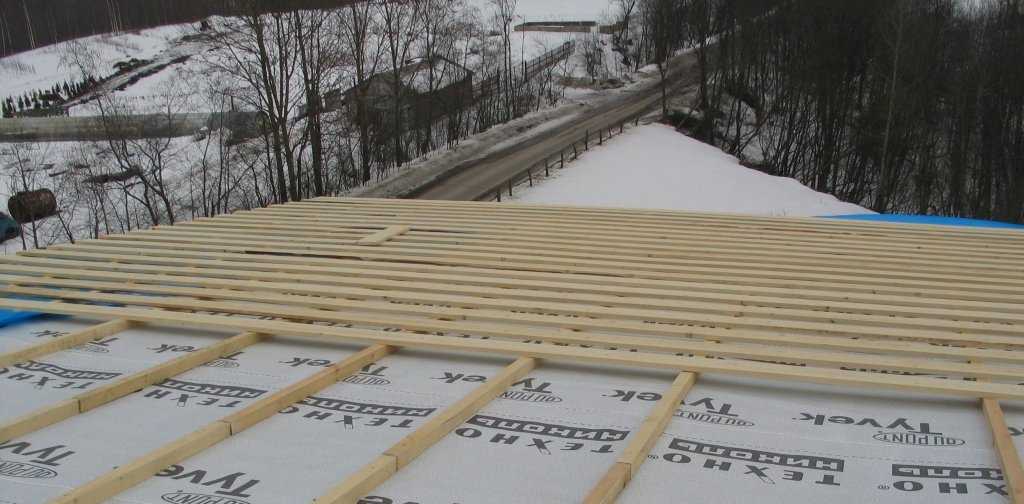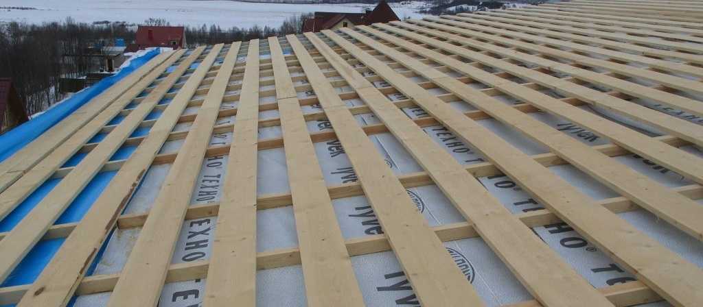 Перед укладкой досок на кровельный скат стропильная система накрывается полотнами супердиффузионной мембраны, обеспечивающей защиту от ветра и попадания влаги в чердачное пространство. Полотна нужно стелить горизонтально, начиная с нижней части, и крепить к верхней плоскости стропил брусками контробрешетки сечением 5 х 5 см. Мембрана должна немного провисать между стропильными ногами для стока воды, а соседние полотна проклеиваться между собой (величина нахлеста – 15 см).